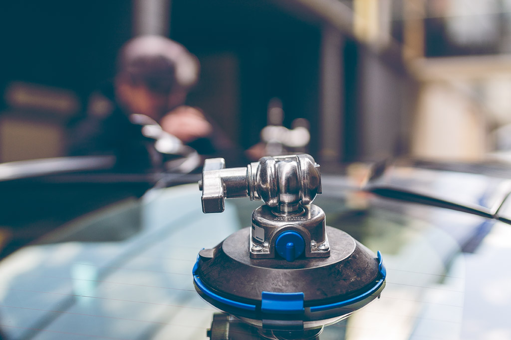 When I have settled on the vision for the shot, I start to get things set up. First, removing the covers from the suction cups and placing them onto the car. I ensure that the car has been freshly washed (and hopefully waxed), or I will spot wipe with the glass cleaner to confirm that no dust is present. If there is dust, repeated use with the suction cups can cause scratched paint so I make sure that everything is clean.
